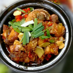 2. Cut the fish head into four quarters, season well before frying, add cornstarch and mix well, heat the oil to above 200 degrees, fry until brown, then add ginger and garlic, stir well Oil, spicy bean paste, bean paste, soy sauce, light soy sauce, simmer over low heat for five minutes and adjust the salt to taste.