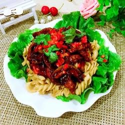 5. Decorate with 3 pieces of lettuce as a base, put on the mixed pasta, and pour Serve black pepper beef tenderloin, sprinkle with a little minced red pepper, and garnish with coriander
