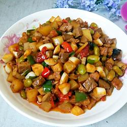 7.Add onion, ginger, garlic, cooking wine, light soy sauce, and dark soy sauce