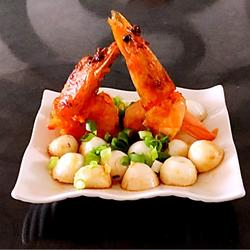 8. Stir-fry the onion, white ginger, add the shrimp and stir-fry until it turns red.Add the quail eggs and fry until golden.Add red wine and salt and simmer for about two minutes