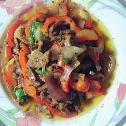 2. Use the remaining oil in the pot to fry onions, bell peppers, and green peppers, add a little Stir-fry with appropriate amount of salt.