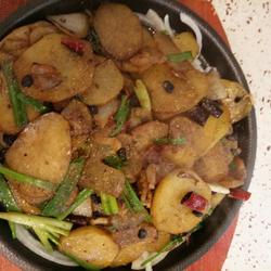 2. Heat the onion, ginger, garlic, tempeh and chili segments in a pot with a small amount of base oil, then add Stir-fry the bacon until raw, add a little cooking wine and soy sauce, add the potato slices and stir-fry evenly! The iron plate needs to be heated in advance with onions!