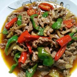 ( 3) Put some oil in the pot, pour the green and red peppers into the pot and fry until they are eight ripe.Set aside.Rinse the pot, heat it up and add oil again.When the pot is not too hot, add Sichuan peppercorns and pickled ginger and wild sansho peppers.Stir-fry the garlic until fragrant, add a little bean paste, stir-fry the beef quickly over high heat, add some light soy sauce and salt, add green and red pepper and chicken essence, stir-fry evenly and serve.It only takes about two minutes for the beef to be put into the pot.It's done when it's cooked, so don't fry it for too long, so the beef will be tender and not so burnt.(Personal practice, please give me some advice if it’s wrong)