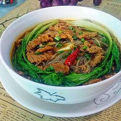 11.Put half a bowl of vermicelli into the noodle bowl, ladle on the beef and soup.Add green vegetables and scallion leaves.