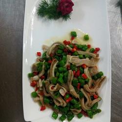 3. Stir-fry method: Add appropriate amount of essential oil, green and red pepper into the pot and stir-fry twice.Add the tripe strips and stir-fry for a few times to season, add salt, MSG, chicken essence, spicy fresh dew, and thicken it