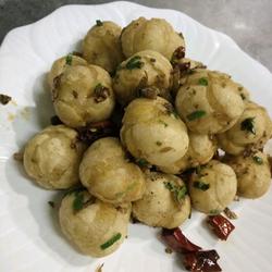 5.Put dried chili peppers and minced garlic into the pot.Stir out the aroma and add a little sugar, a little chicken essence and salted sauerkraut.A little red oil.Spoon and cool twice.Add the blistered glutinous rice balls and minced garlic leaves to the pot, turn off the heat and stir-fry for a few times before serving.Will make it for guests next time.Take a nice photo to add to it! I've been too busy recently.I don’t have time to take photos and post the recipe.