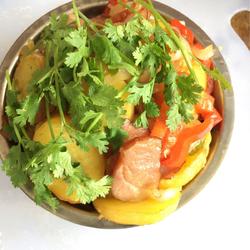 7.Put the bacon and green and red peppers into the pot and stir-fry