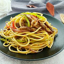 Recipe of stir-fried spaghetti with black pepper beef fillet