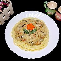 9.Place the spaghetti on a plate, top with mushroom and smoked pork belly spaghetti sauce, serve at the table, mix well when enjoying Yes (you can add or omit the small flowers decorated with cucumbers and carrots if you like)