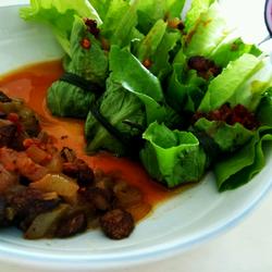 6.Then wrap the fried minced cucumber in lettuce, tie it with straw rope and pour it with chili sauce
