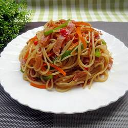 4. Add ham, green pepper and carrot shreds and stir-fry.
