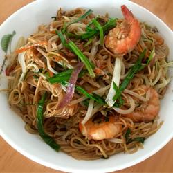 3.Pour the bean sprouts, carrots, leeks, shallots and shrimp into the pot and stir-fry quickly for about 4 minutes.Add appropriate amount of salt.