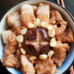 3.Put in the pork belly, mushrooms, and turn on the rice cooker to cooking mode