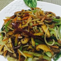 7. Add the carotene and shredded mushrooms to the pot in turn and stir-fry until soft.