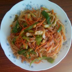 5. Heat 60% oil, add shredded pork and stir-fry, add onion, ginger, garlic, millet and pepper and sauté fragrant.