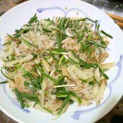 5. Heat oil and sauté garlic slices until fragrant.Add pickles and stir-fry, then add rice noodles and stir-fry.Finally, add salt, soy sauce, chicken essence and green onions and stir-fry evenly