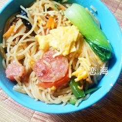 6.Put in the soaked rice noodles, add an appropriate amount of soy sauce to adjust the color, add salt and chicken essence to taste and stir-fry quickly, add eggs