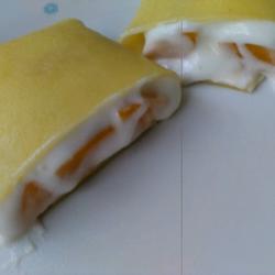 6. Put some light cream in the center of the pancake, then put the cut mango strips, and then Cover with additional whipped cream.