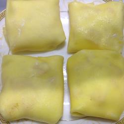 7.Take a small spoonful of light cream and put it on the pancake, then put an appropriate amount of mango pulp, and then put a layer of cream