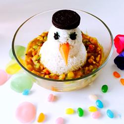 14. You can also decorate it according to your own ideas.I use a small tea cup to hold rice buttons.On the upper layer, use Oreo cookies to make the hat, carrots to make the nose, and cut out two eyes from the seaweed slices.You can use it as you like.I didn’t make it pretty.