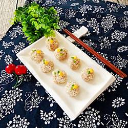 5.After serving, put some green onion and corn on each pearl meatball for decoration.The finished product picture is as follows.