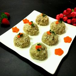 6. Stir the meat and make about 50 grams of meatballs.Roll them in drained glutinous rice so that the meatballs are completely covered with a layer of glutinous rice