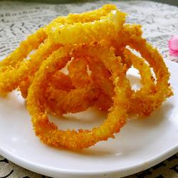 6.Pour an appropriate amount of oil into the pan.When the oil temperature is 50% hot, add the onion rings.Slowly fry over low heat until golden brown, drain the oil on the surface