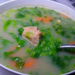 7. Use a strainer to filter the cooked dragon bone soup into a wok, turn up the heat and cook Prepared corn peas and carrots.When these vegetables are cooked, add shredded lettuce and minced coriander, simmer for a while, turn off the heat and remove from the pot.