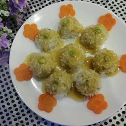 5.Knead the meat filling into a ball and roll it evenly with glutinous rice.
