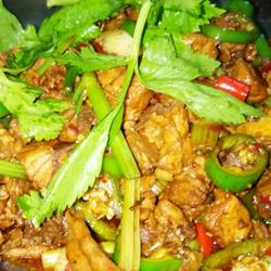 2. Add oil to the pot and heat until 80%.Stir-fry the chicken until golden brown.Add the bean paste, soy sauce slices, and garlic slices.Stir-fry until flavorful.Add half a bowl of water and cover with low heat for 30 minutes.