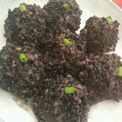 5. Shape the minced meat into a ball shape and wrap it in black rice.