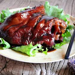 11.Add the ingredients package and boiled sugar color, and the water will cover more than half of the elbow.Bring to a boil over high heat, cover and cook over low heat for two hours, turning your elbows over once in the middle.