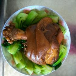 8. Cut the Shanghai green Cut it into four with a cross knife, blanch it and place it on a plate, take out the elbow and put it on the plate.Finally, heat the elbow soup in another pot, add water and starch, boil it into a thick sauce and pour it over
