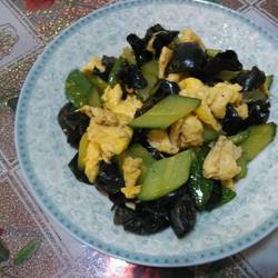 4.Put a little oil into the pot and sauté the onions and garlic until fragrant.Add the fungus first and stir-fry the cucumber for a while (until the fungus snaps), then add the eggs and stir-fry the seasonings evenly