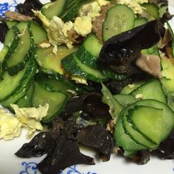 9.Add fungus, stir-fry, then add cucumber, stir-fry evenly, and add some salt