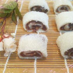 7. Sprinkle crushed peanuts on the red bean paste and roll it into a roll.