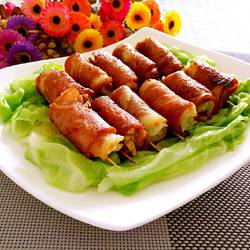 8. Place blanched cabbage on the bottom of the plate, and stack the fried bacon rolls on top of the cabbage.