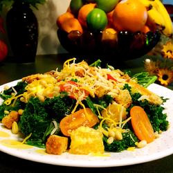 10. Sprinkle pine nuts, crispy bread crumbs and cheese shreds on top of the ingredients, and a beautiful kale salad is ready.