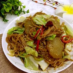 4. Heat oil in a wok and sauté half of the shallots.Add garlic and red pepper, then add cabbage and stir-fry for a while, then add shredded green and red pepper and onion and stir-fry for a while.