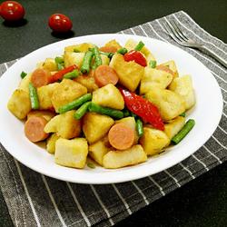 8.Pour in the beans, ham and red pepper and stir-fry.