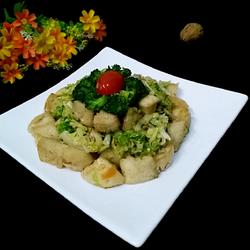7. Stir-fry the steamed buns for about two minutes and add the Holy Stir-fry the female fruits and broccoli and turn off the heat.