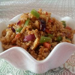 After the chopped vegetables and ham are fried, you can directly add the potatoes, rub and stir-fry.I served it out to prevent the onions and peppers from changing color due to the influence of the soy sauce.