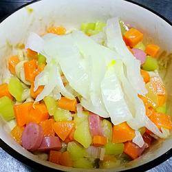4. Add base oil to the pot, heat 30% of the heat, add onion and ginger and saute until fragrant , add diced carrots and zucchini and stir-fry for 2 minutes, add sausages and stir-fry, add water to cover the coriander, heat until cooked, add appropriate amount of salt, vinegar, and a small amount of light soy sauce