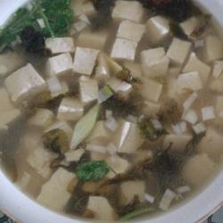 2. Fill the pot with half a spoonful of oil, pour in the chopped green onion, stir fry the pot and then fill it with water (an soup Pour water as much as a bowl) Add salt, MSG, chicken powder, tofu, and seaweed to the pot