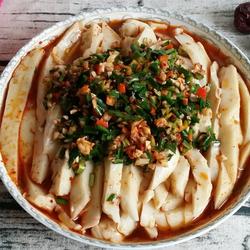 3.Cut the leeks into small pieces, mince the green and red peppers and garlic, add chili powder and Sichuan pepper powder, heat the oil in the wok and pour it over