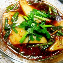 8.Add salt, chili pepper, vinegar and soy sauce, add garlic, water and chicken essence to make a sauce, add a few slices and stir into a dough, top with leeks and add small pieces to eat