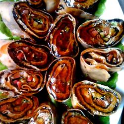 15.Cut diagonally into sections, place the lettuce on the bottom, and arrange on a plate.If you like sauce, you can boil some juice and pour it on top.