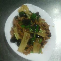 1.Cut the ingredients and wash them, use eggs for the meat, stir-fry the flour, set aside, add oil, first simmer the meat, crisp the bamboo shoots, and cook the fungus together until the oil is gone