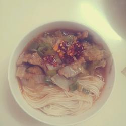 8.Pop the noodles, add vegetables, and add homemade hot sauce.A delicious chicken, cabbage and steamed rice noodles will be OK.