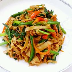 3. Stir-fry the tofu skin until slightly rolled.Add dark soy sauce and stir well.Add leeks and season with salt.